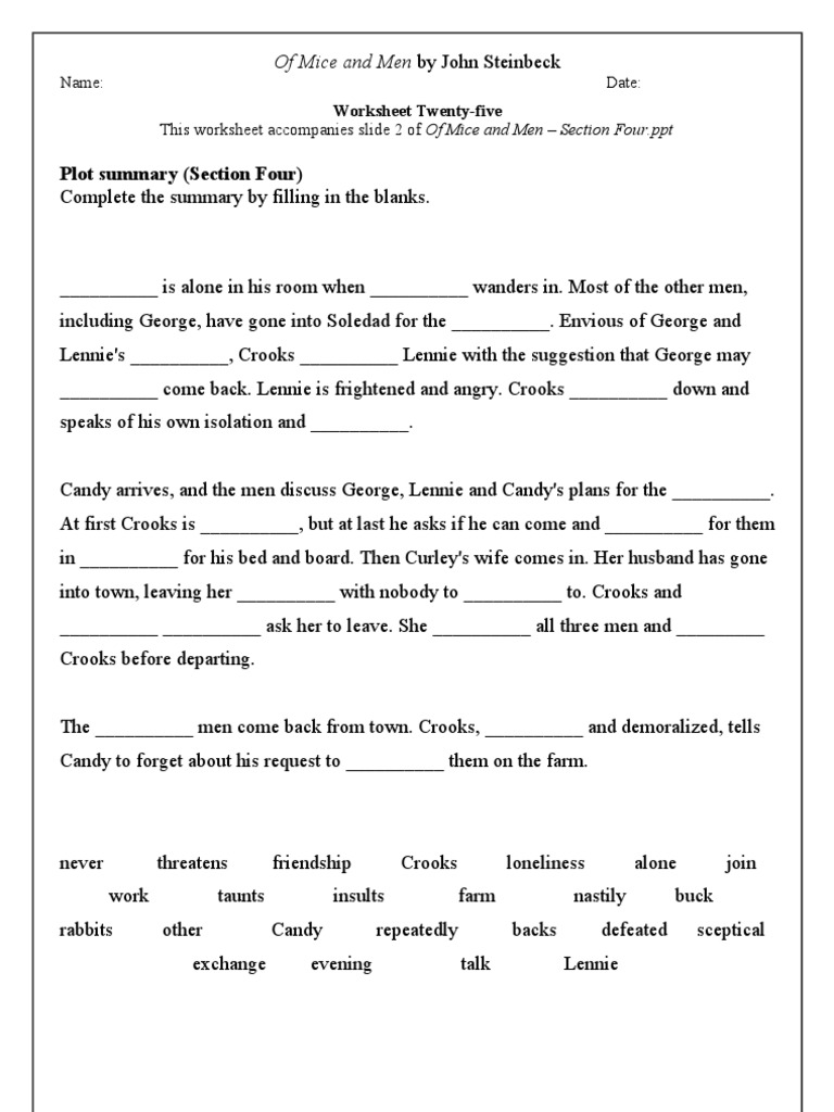 Of Mice And Men Section Three Plot Summary Exercise Complete The Plot Summary By Filling In The Blanks George Chats To About His Relationship Ppt Download
